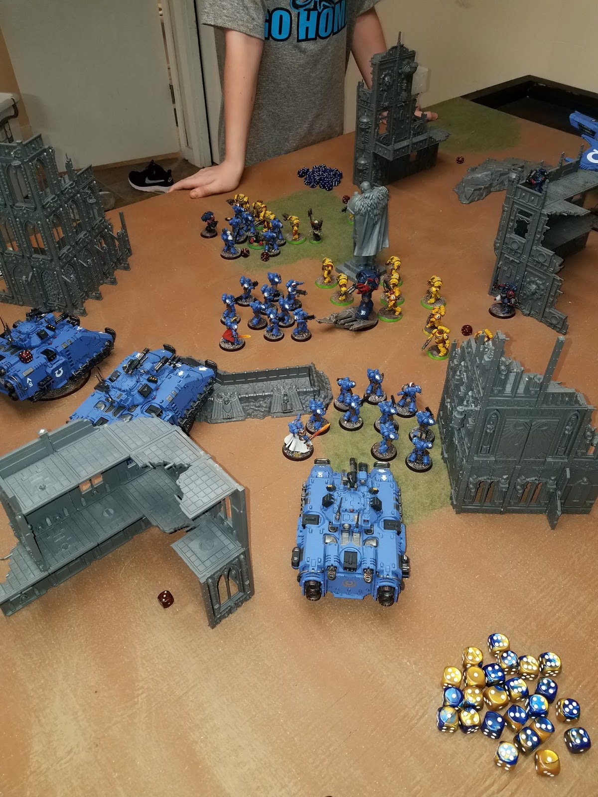 Things were still looking good for the boys in blue. I turned the Xiphon back up field, and prepared to lay the hurt on the Contemptor, if I could just get it out of combat. The Cataphractii Assault Squad and Contemptor were taking a horrible toll on my foot troops, so they needed to be dealt with. The librarian was finally able to remember his spells, and used Psychic Scourge and Fury of the Ancients to put some wounds on the Gravis Captain, who was then rapid fired by the Intercessor squad. I poured fire with onslaught and heavy onslaught alike, and the insane powerful shots from the Xiphon, but the danged Cataphractii and Contemptor are just hard nuts to crack. Atomantic invulnerable saves are a pain!!!! I was finally able to remove the last 3 tactical marines, reducing my sons anti tank capability to the Contemptor and melee. Finishing off the Fight phase, his Lightning claw terminators and contemptor wrecked the unit of Intercessors, leaving the Ultramarines Lieutenant to carve through the last of the Imperial Fists intercessors.